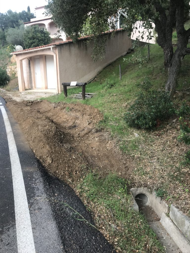 Il a été creusé un petit fossé pour diriger ces eaux vers le caniveau, nous verrons aux prochaines pluies si c’est efficace, sinon nous le maçonnerons, il a été profité de la pelleteuse pour enlever deux agaves mortes sur le talus de l’Ave des cistes. Il a été également procédé au débouchage des caniveaux sous les grilles devant les entrées de Mr Van Elegem et Mme Danglade